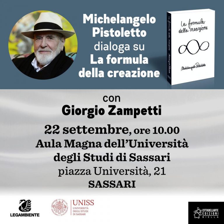 Uno degli artisti viventi più concettuali ispirati apprezzati e sensibili del globo, Michelangelo Pistoletto. Un libro di 347 pagine (“La formula della creazione”, editore Cittàdellarte Biella) che attraverso 31 passi porta dalla genesi del lavoro del maestro alla genesi dell’u-diverso e – in parallelo – alla genesi di una nuova società. Un luogo simbolo del saper sassarese, isolano e nazionale: l’Università degli Studi di Sassari. Una vera “Istituzione ambientale” a difesa della sostenibilità e dell’ambiente sempre attenta alla difesa delle meraviglie della creazione. Un evento da rosso sul calendario costruito su questi tre straordinari elementi, voluto da Legambiente Sassari e fissato per le ore 10 di venerdì 22 settembre sotto la splendida volta dell’Aula Magna dell’Università degli Studi di Sassari in piazza Università gentilmente messa a disposizione dal magnifico rettore Gavino Mariotti. A Dialogare con il maestro sarà il presidente nazionale di Legambiente Giorgio Zampetti. In platea saranno presenti rappresentanze di studenti del liceo “Azuni”, del liceo “Spano”, della scuola media “Salvatore Farina” e dell’Università di Sassari. Introduce il giornalista Giovanni Dessole.
