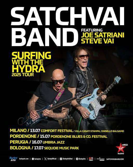 Dopo gli innumerevoli tour coi G3, i leggendari Joe Satriani e Steve Vai saranno finalmente insieme sul palco con un’unica band – la SatchVai Band – per quattro appuntamenti del Surfing With The Hydra Tour 2025 davvero imperdibili per gli appassionati del mondo della sei corde: