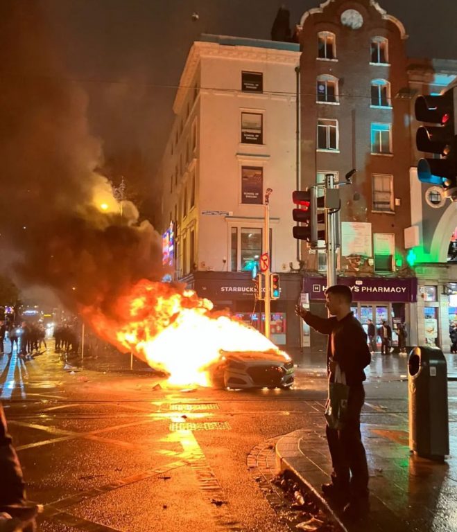 Incidenti sono scoppiati in serata a Dublino e un’auto della polizia è stata data alle fiamme non lontano dall’accoltellamento di fronte ad una scuola che ha provocato il ferimento di cinque persone, tra cui tre bambini.