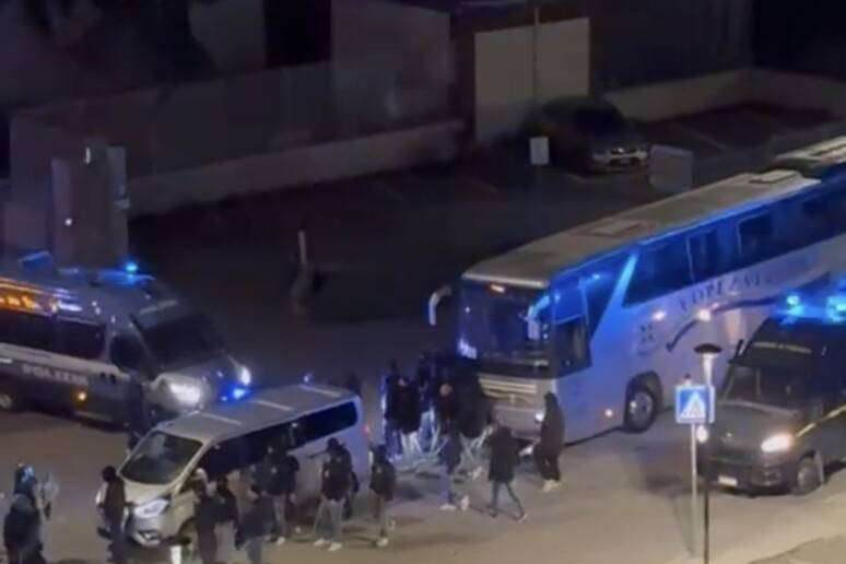 Scontri tra ultras del Catanzaro e la polizia al termine del derby di serie B con il Cosenza.
