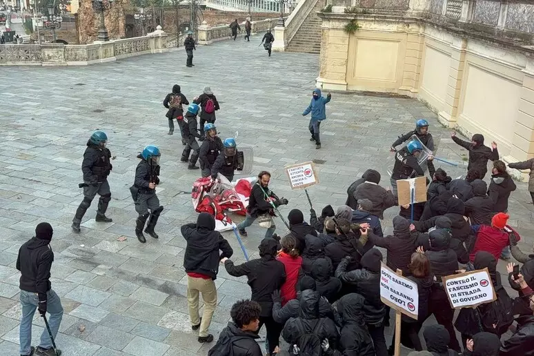 Scontri tra i manifestanti del corteo antifascista a Bologna e la polizia, in tenuta antisommossa, sulla scalinata del Pincio.