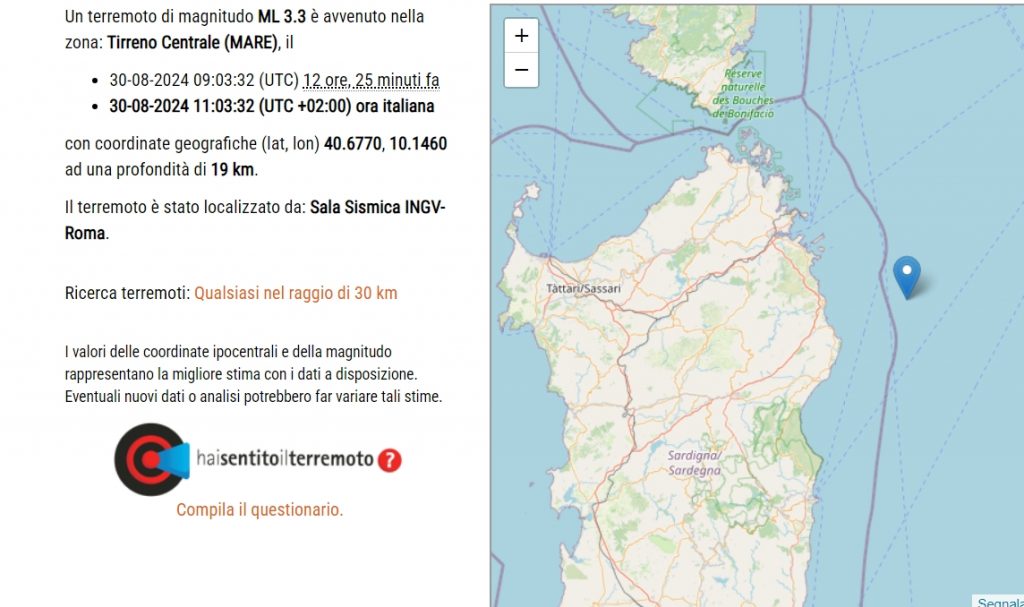 L’Istituto nazionale di geofisica e vulcanologia ha localizzato alle 11.03 di oggi un terremoto di magnitudo 3.3 al largo della costa nord-orientale della Sardegna.