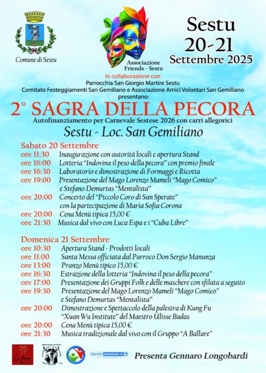 L’Associazione F.R.I.E.N.D.S APS di Sestu ha promosso, per il secondo anno, la Sagra della Pecora, che si terrà il 20 e 21 settembre presso la suggestiva cornice di San Gemiliano a Sestu.