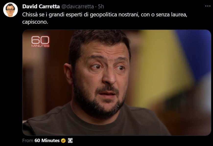 Oggi le cheerleaders pro-Kiev stanno condividendo a rotta di collo questo video in cui Zelensky dice delle assolute banalità, ma per loro sarebbero parole illuminanti. Praticamente dice che non può concedere alcun territorio alla Russia perché altrimenti cosa direbbe ai figli dei soldati ucraini morti in guerra? Finissima analisi geopolitica da studiare dalla mattina alla sera, prendiamo appunti.