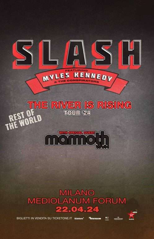 Slash torna in Italia, infatti l’acclamato chitarrista dei Guns N’ Roses annuncia il “The River Is Rising – Rest Of The World Tour 24”, che lo vedrà nel nostro Paese insieme a Myles Kenedy & the Conspirators per un unico appuntamento.