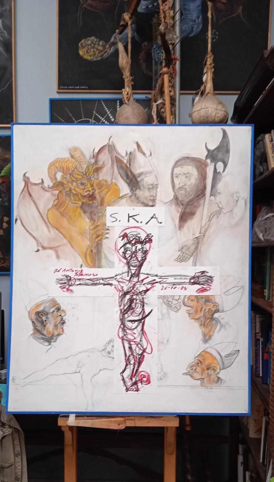 Non c’è artista contemporaneo che non utilizzi strategie di marketing per l’affermazione del Sé dinanzi alla sua storia, o più mestamente per tirare a campare, delle due strade io ho scelto quella lunga, quella della lungimiranza che antepone il processo al prodotto, nel nome di questo ho messo in campo tutta l’irrazionalità processuale possibile per negare il mercato dominante e la sua omologante conformità che determina generi linguistici affondando la mia relazione con chi si pone dinanzi al mio lavoro nel territorio comune dell’inconscio individuale (collettivo e connettivo) che passa attraverso il simbolo. Scopro così. a distanza di quasi trent’anni, che il mio lavoro, che abbandonavo e consentivo a chiunque di prelevare o distruggere in vicoli e luoghi fondamentali della storia e della memoria Napoletana, sono stati custoditi per preservarne la storia.