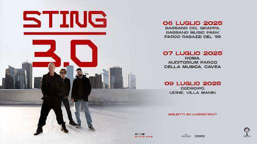 Tre appuntamenti live con Sting. Il musicista britannico ha annunciato le date italiane del tour Sting 3.0: il 6 luglio a Bassano Del Grappa, il 7 luglio a Roma e il 9 luglio a Codroipo.