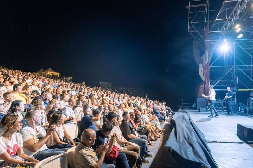 Una serata perfetta, da incorniciare. Con il vento che profuma di mare, la luna piena che illumina il teatro di Tharros e la voce di Federico Zampaglione a guidare un viaggio musicale lungo 25 anni. Il concerto dei Tiromancino, nell’ambito della rassegna I Giganti dell’Arte promossa dalla Fondazione Mont’e Prama, ha conquistato 1.200 persone, in piedi a cantare, ballare e lasciarsi trasportare da un repertorio che è ormai parte della storia più recente della musica italiana.