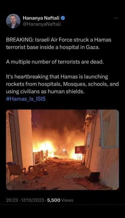 Senza mezzi termini è scritto nero su bianco che “Israele ha appena attaccato una base di Hamas all’interno dell’ospedale di Gaza…Un alto numero di terroristi sono morti…è devstante che Hamas lanci razzi da una base interna all’ospedale…”