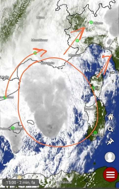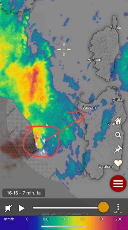 Una supercella temporalesca si è sviluppate sul mare di Sardegna ed è in progressione verso le coste occidentali della Sardegna, dove saranno possibili forti temporali e grandinate.