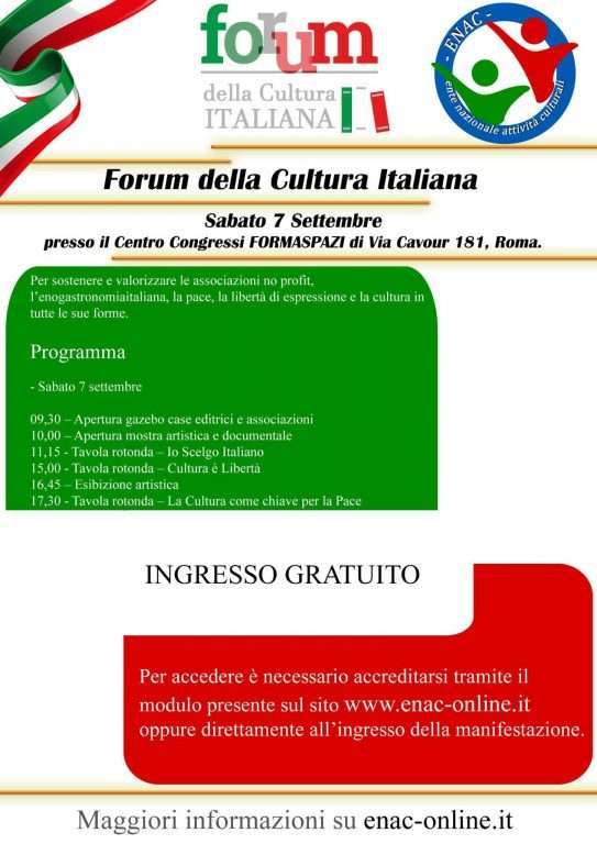 “In un mondo sempre più connesso – dichiarano gli organizzatori – nel quale le persone finiscono per conoscersi a distanza ma riescono ad ignorarsi in presenza, è necessario ripristinare quelle relazioni sociali indispensabili per armonizzare i naturali rapporti umani, minati costantemente dalle moderne tecnologie e acutizzate in seguito alla recente emergenza sanitaria. Il Forum della Cultura Italiana – spiegano – nasce dal desiderio di dare spazio a coloro che spesso, per diversi motivi, non hanno a disposizione spazi nei quali esprimersi”. L’evento è realizzato per sostenere e valorizzare le associazioni no profit, l’enogastronomia italiana, la pace, la libertà di espressione e la cultura in tutte le sue forme.