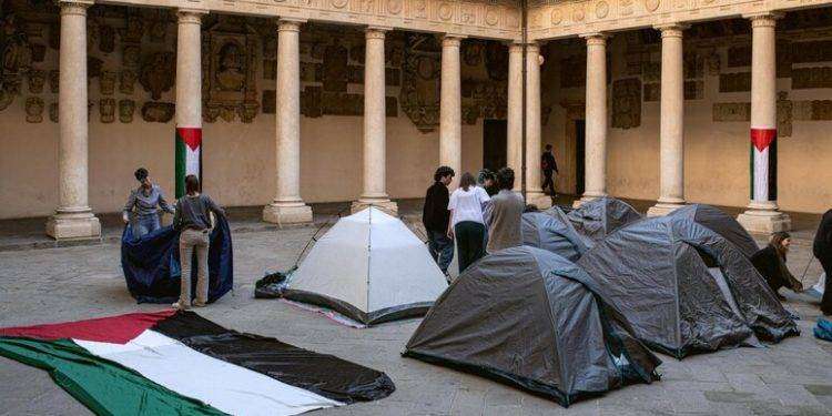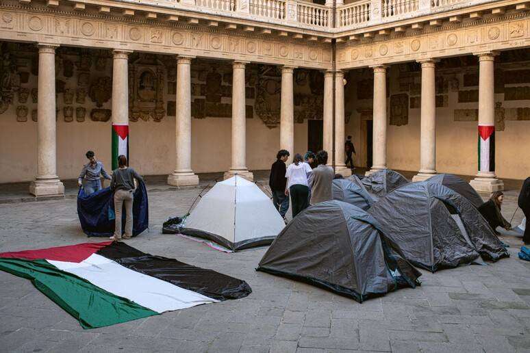 Tende per manifestare solidarietà alla Palestina sono state piantate stamani da studenti nel cortile del Palazzo del Bo, sede dell’ateneo di Padova.