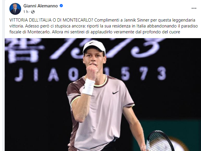 “Complimenti a Jannik Sinner per questa leggendaria vittoria. Adesso pero’ ci stupisca ancora: riporti la sua residenza in Italia abbandonando il paradiso fiscale di Montecarlo. Allora mi sentirei di applaudirlo veramente dal profondo del cuore”.