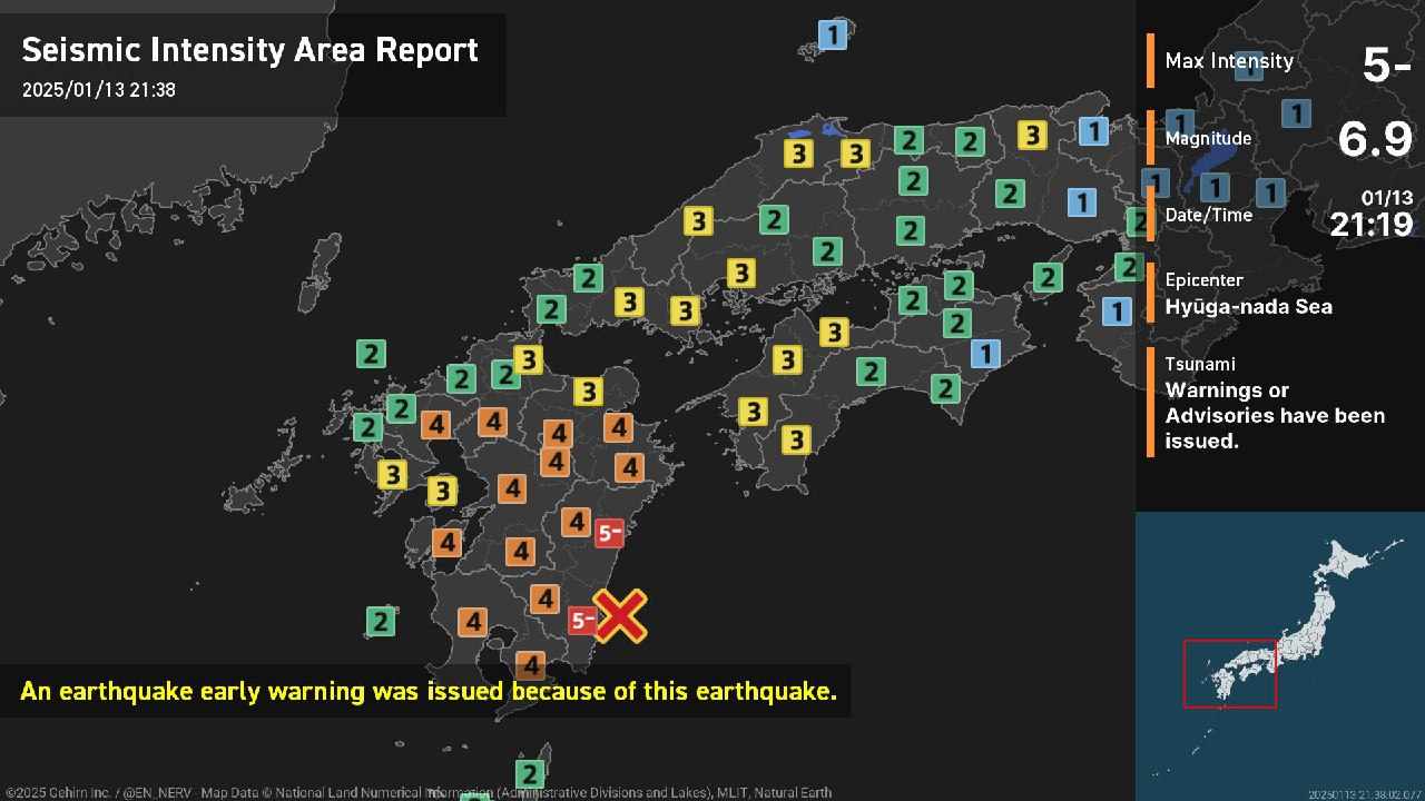 Un terremoto di magnitudo 6.9 ha colpito il sudovest del Giappone ed è scattata l’allerta tsunami per le prefetture di Miyazaki e Kochi. Lo riferisce l’agenzia Kyodo. Il sisma è stato registrato alle 21.19 ora locale.