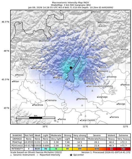 Il 09 Gennaio 2026 ore 15:28 è stata registrata una scossa di terremoto di magnitudo 3.4 e profondità 10.2 km a Gargnano (BS).