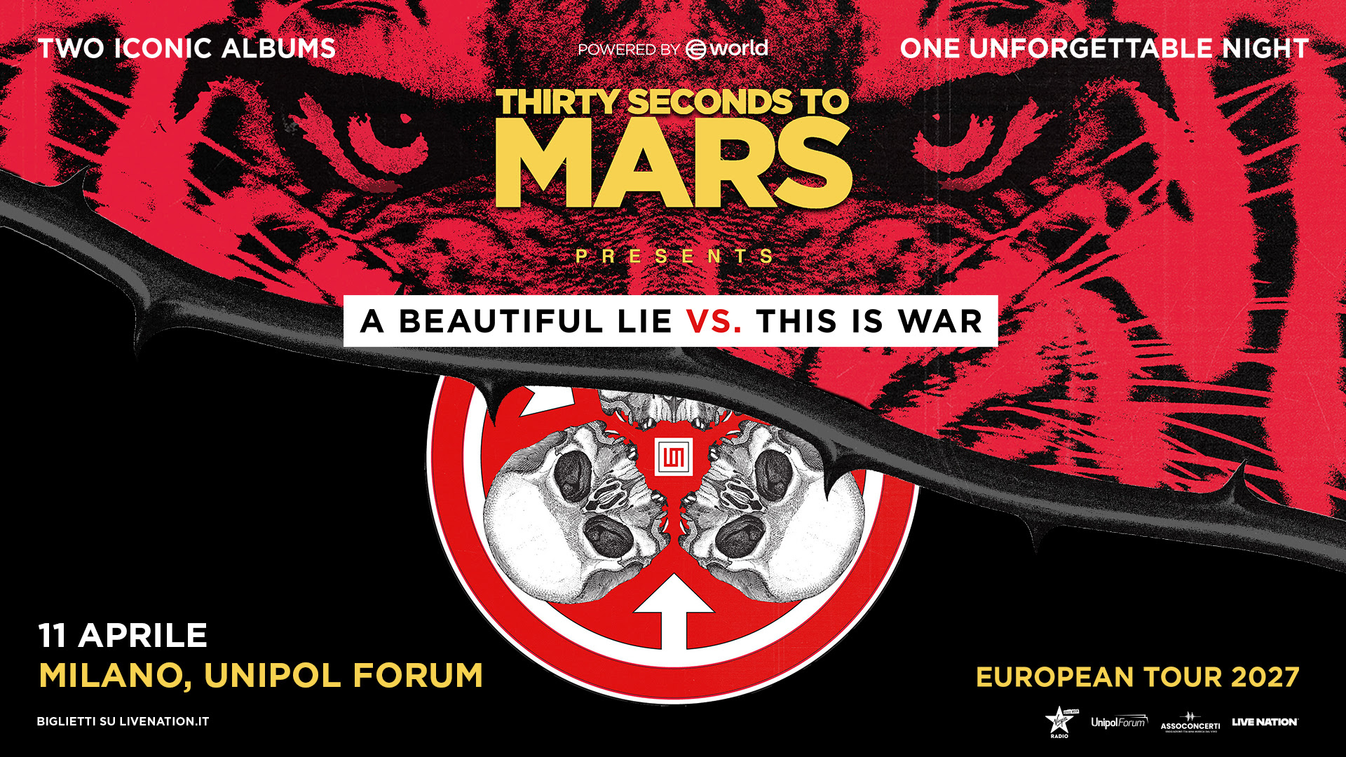 Live Nation annuncia il ritorno in Italia dei Thirty Seconds To Mars. La band guidata da Jared Leto sarà protagonista di un unico imperdibile appuntamento domenica 11 aprile 2027 all’Unipol Forum di Milano, nell’ambito del nuovo tour internazionale A Beautiful Lie vs This Is War.