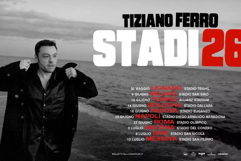 Tiziano Ferro torna live negli stadi italiani nel 2026 con 10 date. Questo il calendario di Stadi26, a tre anni di distanza dall’ultimo tour: 30 maggio Lignano, 6 giugno Milano, 10 giugno Torino, 14 giugno Bologna, 18 giugno Padova, 23 giugno Napoli, 27 giugno Roma, 3 luglio Ancona, 8 luglio Bari, 12 luglio Messina.