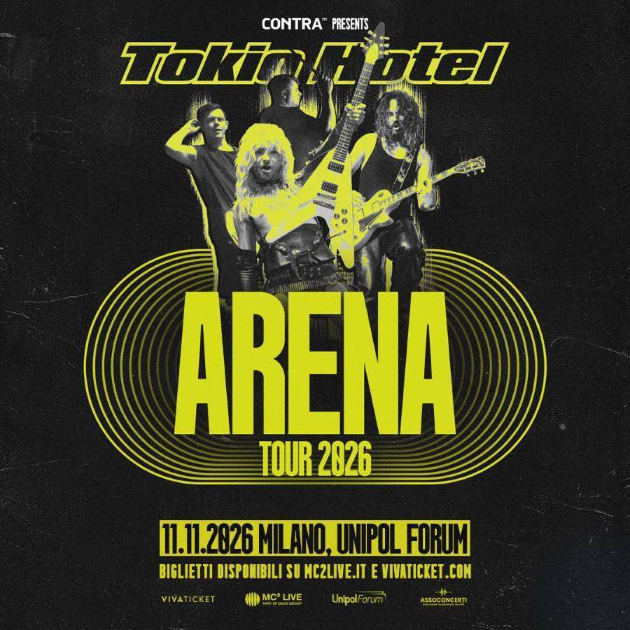 I Tokio Hotel sono tornati più grandi che mai! Dopo i loro tour di successo in Nord e Sudamerica e un tour europeo completamente sold-out nel 2025, la band stabilirà nuovi standard con l’ARENA TOUR 2026. Con show dal vivo spettacolari in alcuni dei maggiori palazzetti d’Europa, i Tokio Hotel promettono ai loro fan un’esperienza di concerto senza pari.