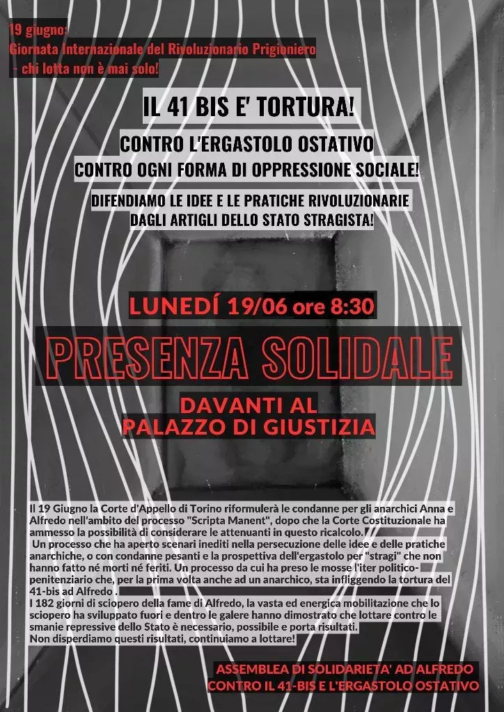 Per chiudere; ci sembra opportuno ricordare che il 19 giugno, ogni anno, ci si mobilita in molte zone del globo per la Giornata Internazionale del Rivoluzionario Prigioniero, data che rinnova la solidarietà a tutt* i/le militanti imprigionat* in memoria del massacro di quasi 300 prigionier* politic* compiuto nel 1986 dall’esercito nelle carceri peruviane”, affermano in una nota gli aderenti all’Assemblea contro il 41-bis e l’ergastolo ostativo di Torino
