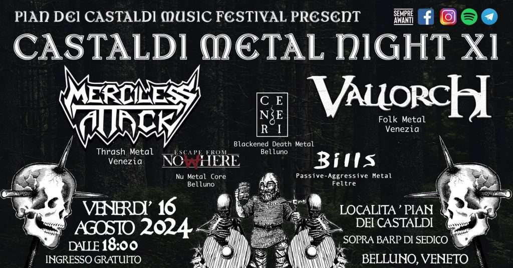 Torna venerdì 16 agosto, per l’undicesima volta consecutiva, la Castaldi Metal Night al Festival di Pian Dei Castaldi (Sedico – Belluno), uno dei festival più longevi della provincia di Belluno.