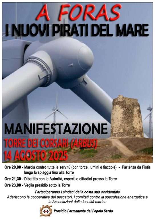 È in programma per giovedì 14 agosto 2025 una manifestazione di protesta a Torre dei Corsari, frazione marina di Arbus, contro il progetto di impianto eolico off shore presentato a maggio dalla società Renewable Energies Limited, con sede a Londra. L’iniziativa, promossa dal Presidio Permanente del Popolo Sardo, punta a denunciare quella che viene definita una “potente operazione di speculazione energetica”, che secondo gli organizzatori rappresenta un grave pericolo per il paesaggio, l’ambiente marino e le attività economiche della costa sud-occidentale sarda.