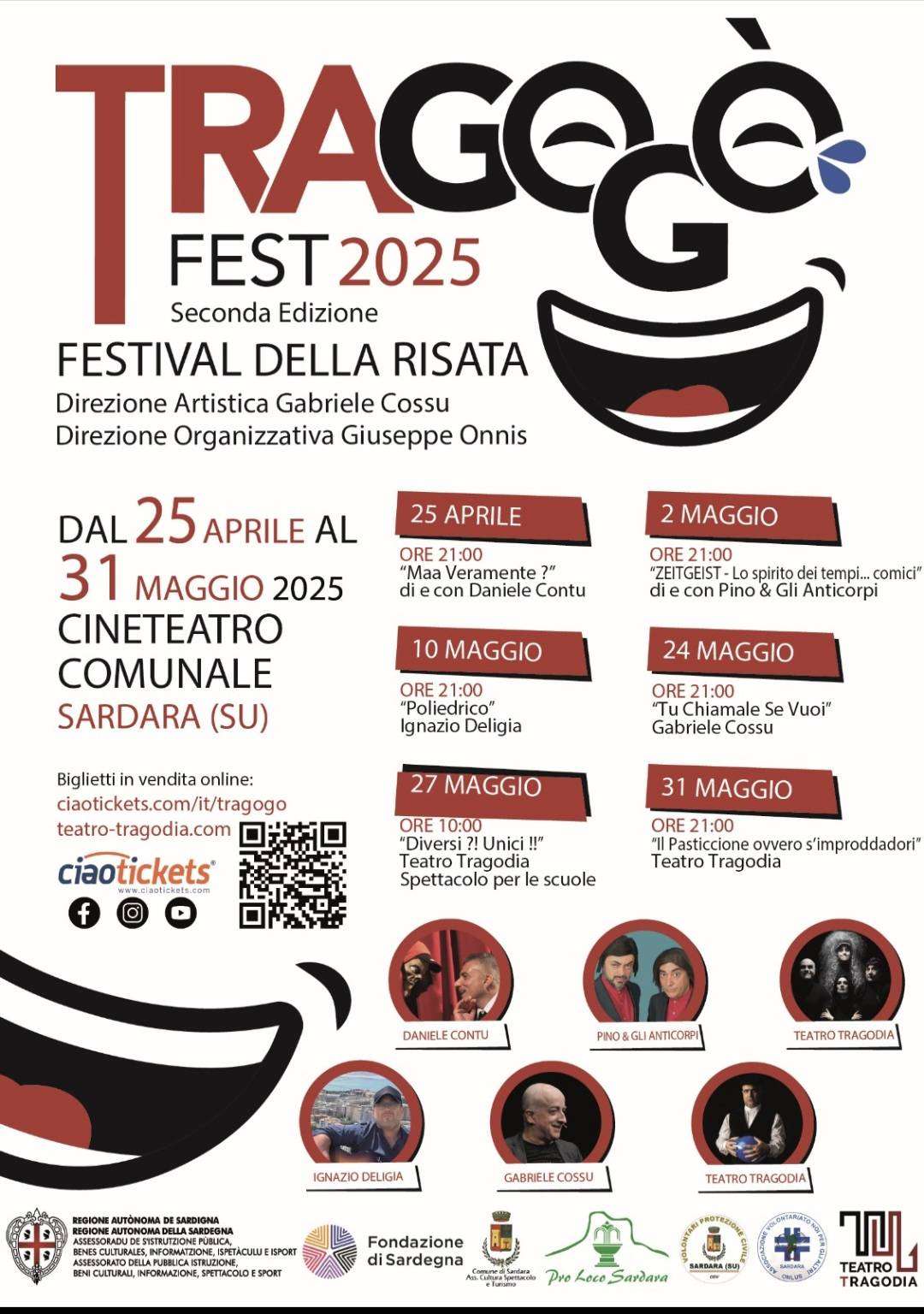 L’arte di far (sor)ridere in scena con Tragogò FEST 2025 / Festival della Risata, importante vetrina della comicità isolana e non solo, ideata e organizzata dall’Associazione Culturale Teatro Tragodia e giunta alla seconda edizione, con la direzione artistica di Gabriele Cossu, in programma dal 25 aprile al 31 maggio al Cine/Teatro Comunale di Sardara, e realizzata con il patrocinio del Comune di Sardara e con il sostegno dell’Assessorato della Pubblica Istruzione, Beni Culturali, Informazione, Spettacolo e Sport della Regione Autonoma della Sardegna e il contributo della Fondazione di Sardegna, e realizzata con la collaborazione della Pro Loco di Sardara, dell’Associazione di Volontariato “Noi per gli Altri” e dell’Associazione di Volontariato della Protezione Civile.