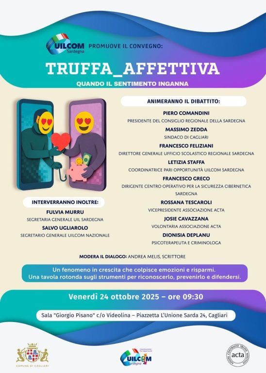 Per frenare il dilagare del fenomeno anche nell’Isola la Uilcom Sardegna ha deciso di scendere in campo organizzando il convegno dal titolo “Truffa_affettiva. Quando il sentimento inganna” che si terrà venerdì 24 ottobre 2025 alle 9,30 nella sala Giorgio Pisano nella sede di Videolina, in piazza Unione Sarda a Cagliari.