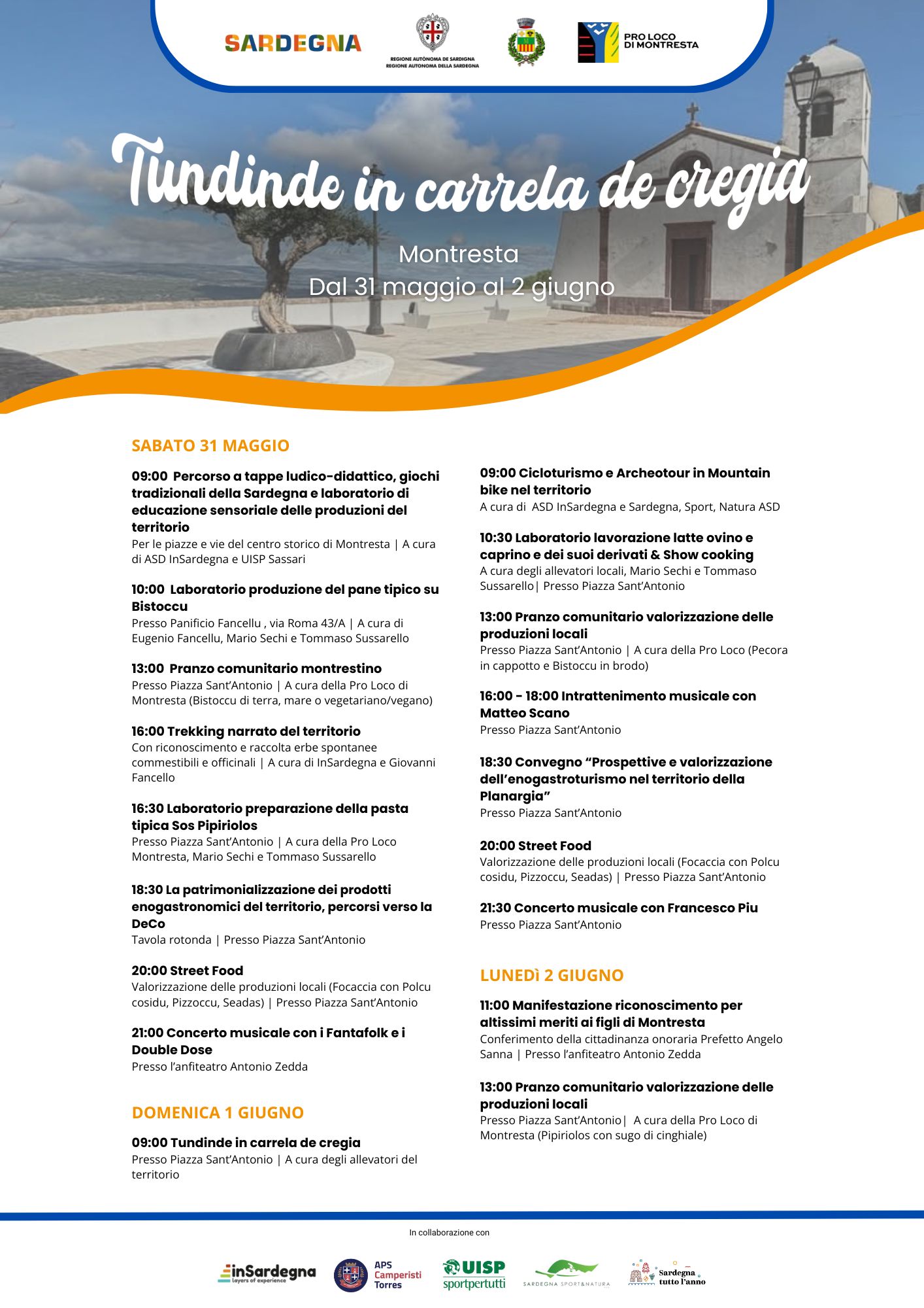 Un intero fine settimana immersi nei saperi, sapori e paesaggi di uno dei borghi più suggestivi della Sardegna: dal 31 maggio al 2 giugno, Montresta ospita “Tundinde in carrela de cregia”, seconda edizione dell’iniziativa del Comune di Montresta con la collaborazione della Pro Loco Montresta, inserita nel cartellone delle manifestazioni