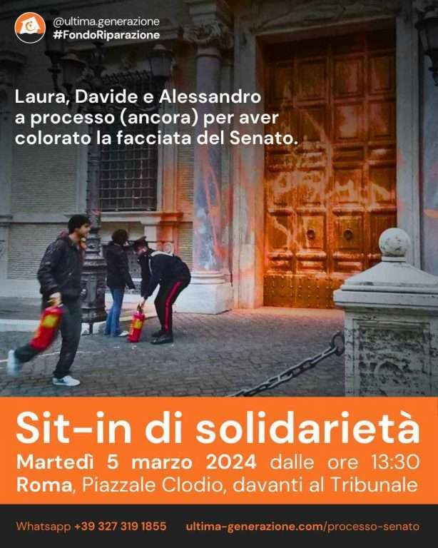 “Il Senato imbrattato è il simbolo del potere dei cittadini. Laura, Davide e Alessandro saranno processati martedì prossimo, probabilmente con sentenza, per aver colorato con vernice arancione la facciata di Palazzo Madama il 2 gennaio 2023”, affermano in una nota gli attivisti del clima.