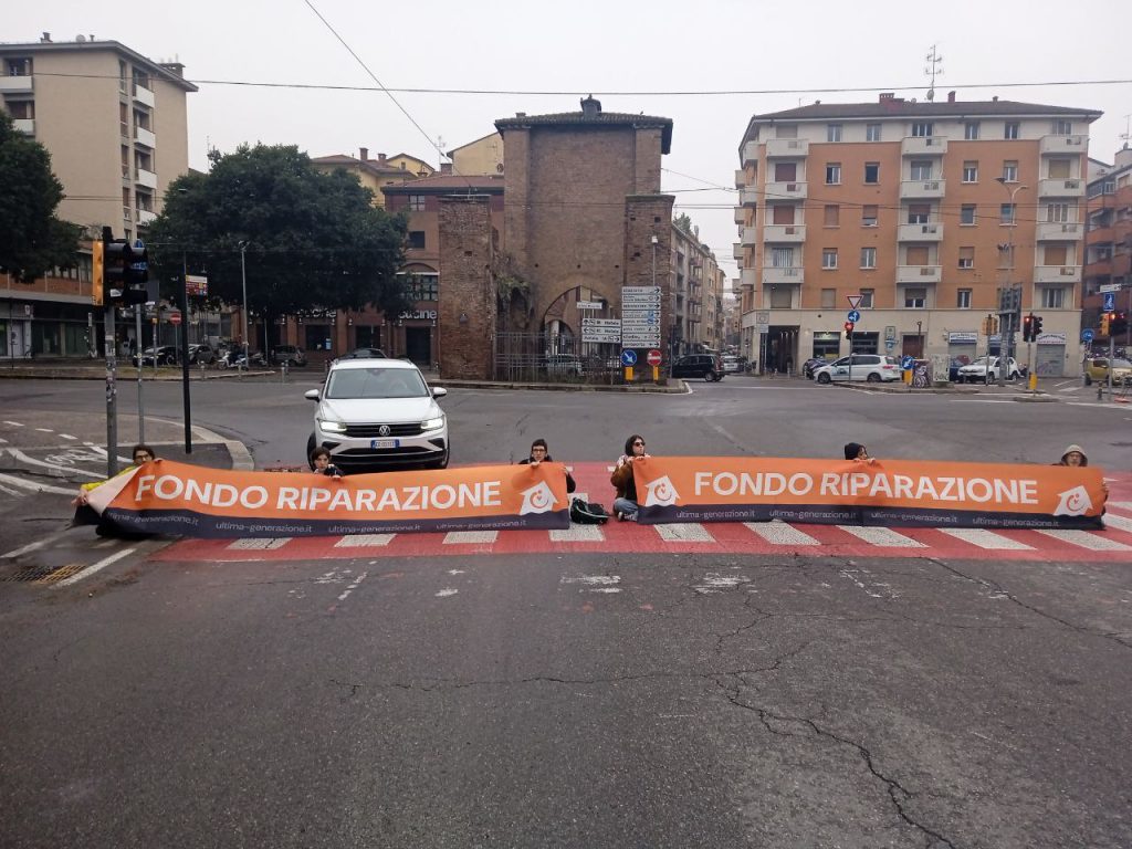 Questa mattina un gruppo di 12 cittadine e cittadini aderenti alla campagna FONDO RIPARAZIONE, promossa da Ultima Generazione, ha effettuato due blocchi stradali molto vicini: uno su Strada Statale 64 Porrettana e l’altro su Strada Statale 9 “Via Emilia”. I cittadini si sono seduti sulla carreggiata, bloccando la circolazione delle auto, hanno srotolato striscioni arancioni con la scritta FONDO RIPARAZIONE e hanno indossato un cartello con i nomi delle vittime dell’alluvione dell’Emilia.