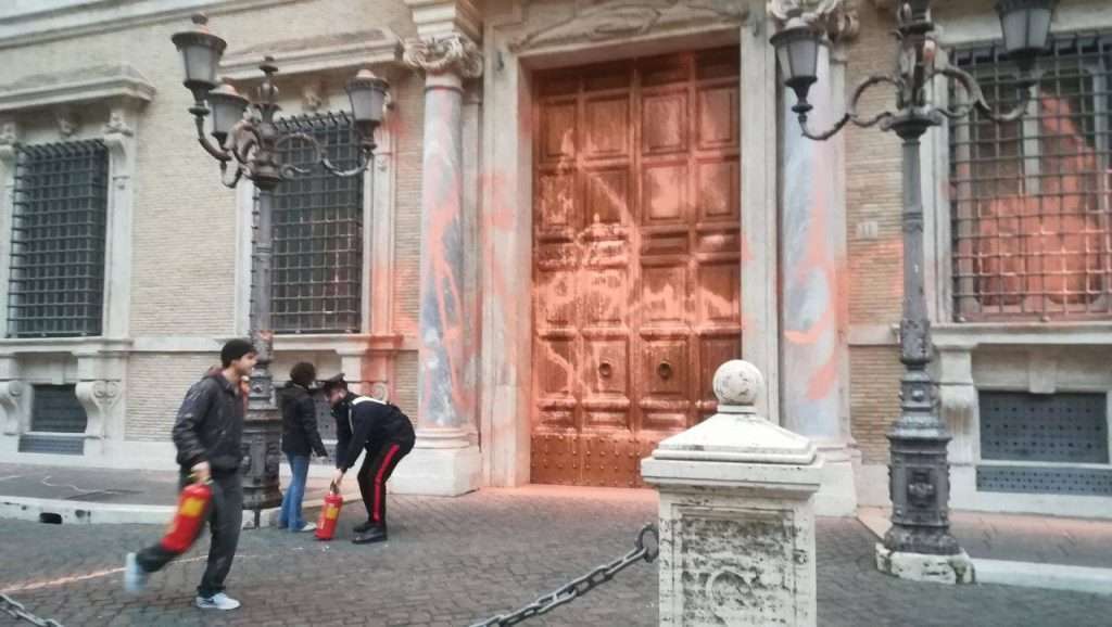 Il blitz nonviolento voleva evidenziare l’inazione del Governo e del Parlamento nei confronti della crisi eco-climatica, di cui l’Italia, in quanto sesto finanziatore a livello mondiale dell’industria dei combustibili fossili, è uno dei principali responsabili. Anche se l’imbrattamento non ha avuto conseguenze (in poche ore la facciata è stata ripulita), le tre persone rischiano una condanna fino a 5 anni di carcere per danneggiamento aggravato.