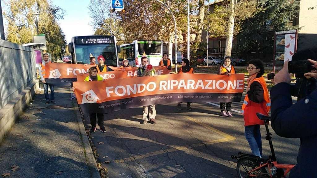 Stamattina 10 cittadine e cittadini aderenti alla campagna FONDO RIPARAZIONE, promossa da Ultima Generazione, hanno effettuato un’azione di disobbedienza civile a Pavia. I manifestanti hanno occupato una parte della carreggiata per effettuare una marcia lenta, che ha avuto inizio alle 11:10 del mattino in Via Umberto Olevano e ha rallentato il traffico. I cittadini hanno proseguito per Piazzale San Giuliano e Viale della Repubblica, camminando fino alla Questura. Qui hanno inscenato un’ironica festa di pensionamento per il congedo lavorativo del Questore Alessio Cesareo, muniti di trombette e regali. Un cittadino della campagna ha letto un diploma, rivolto al Questore, riportante ironici meriti e pregi dell’operato dello stesso. Le forze dell’ordine sono arrivate alle 11:58, hanno impedito ai manifestanti di fare un blocco stradale in Viale della Repubblica e li hanno trascinati in Questura intorno alle 12:20.