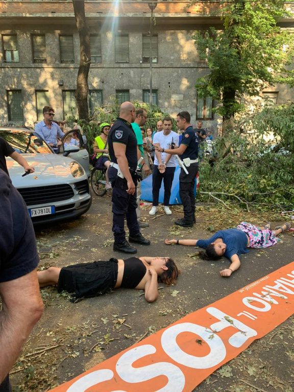 L’azione dimostrativa ha messo in evidenza i sintomi della crisi climatica in corso, con l’Italia divisa tra temporali violentissimi e incendi incontrollati: due facce della stessa medaglia. I video mostrano anche una forte polarizzazione tra i passanti, alcuni molto solidali con chi era seduto per terra e altri fortemente aggressivi. Dopo pochi minuti è intervenuta la Polizia Locale che ha spostato le persone che hanno partecipato all’azione e le ha identificate.