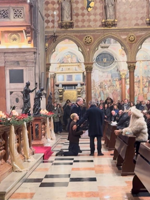 Federica, 17 anni, inginocchiata all’altare ha letto in chiesa: “Questo non è un Natale di gioia. Come possiamo cantare mentre a Gaza si muore? Come facciamo a fare finta di niente quando ai nostri figli ci aspetta un futuro di siccità, carestie, inquinamento e collasso? Come possiamo pensare al pranzo di Natale mentre fuori di qui qualcuno deve scegliere tra le bollette ed il cibo? In un Paese che non sa cosa vuol dire essere unito, come affrontare i prossimi anni insieme, senza lasciare indietro nessuno?