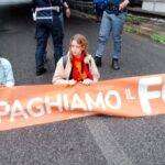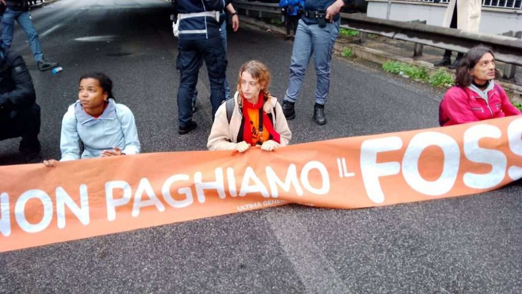 Questa mattina verso le ore 08:30, 14 cittadini e cittadine di Ultima Generazione hanno bloccato il traffico a Roma, nella tangenziale Est, alcune sedendosi sull’asfalto della carreggiata del senso di marcia che conduce verso la zona Nomentana e altre calandosi da un ponte di via delle Valli. Con loro alcuni striscioni con scritto “NON PAGHIAMO IL FOSSILE”. I cittadini della campagna di disobbedienza civile per tutta la durata dell’azione hanno dialogato con gli automobilisti presenti, discutendo della gravità della situazione climatica corrente e dell’inaccettabilità dell’inazione della Politica per contenerne i danni. Dopo pochi minuti di blocco, sono arrivate sul posto le Forze dell’ordine, che in poco tempo hanno fermato i presenti che si trovavano sulla strada, mentre alle ore 10:00 è iniziato l’intervento dei Vigili del fuoco per portare via le persone che erano appese al ponte e si è concluso dopo 30 minuti. Il traffico è stato bloccato in diversi intervalli. Le persone portate via dalla polizia in alcuni commissariati della zona.