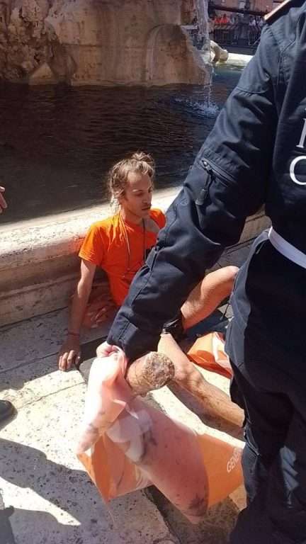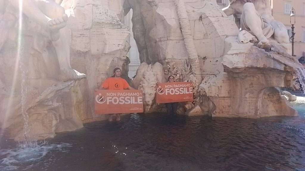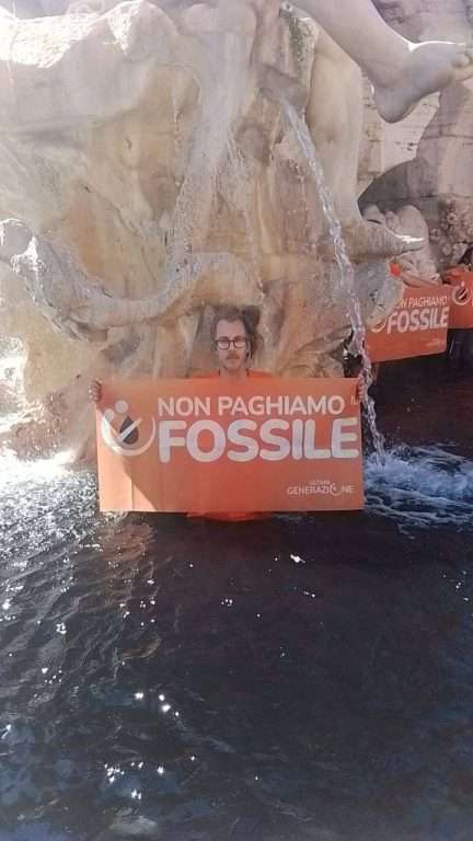 Alle 15:30 quattro persone legate alla campagna NON PAGHIAMO IL FOSSILE, promossa da Ultima Generazione, hanno versato carbone vegetale diluito in acqua nella Fontana dei Quattro Fiumi a piazza Navona per lanciare l’allarme sul futuro nero che attende l’umanità e che si sta già manifestando con siccità e alluvioni sempre più frequanti. Immediato l’intervento delle Forze dell’ordine, che alle 15:45 hanno portato via gli attivisti.