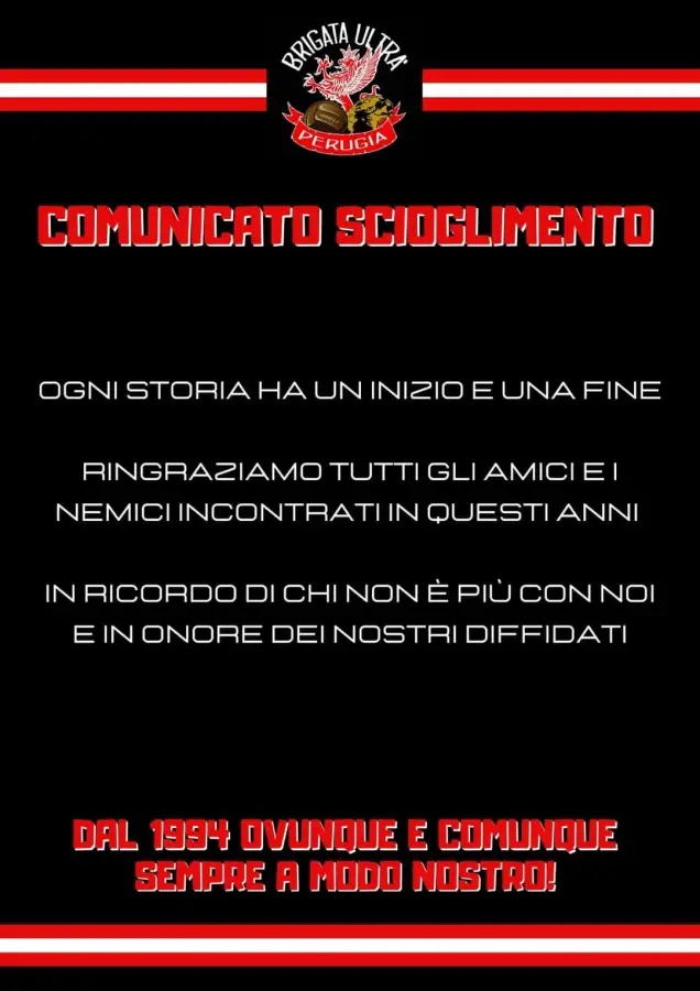 Dopo 31 anni la Curva Nord dello stadio Renato Curi sarà orfana di uno dei suoi gruppi storici. E’ stato dichiarato in data odierna lo scioglimento della Brigata Ultrà, che dunque cesserà di esistere.