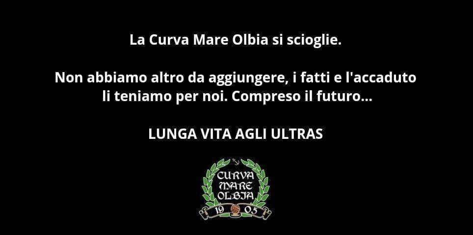 “La Curva Mare Olbia si scioglie, non abbiamo altro da aggiungere, I fatti è l’accaduto lo teniamo per noi. Compreso il futuro. Lunga vita agli ultras”.