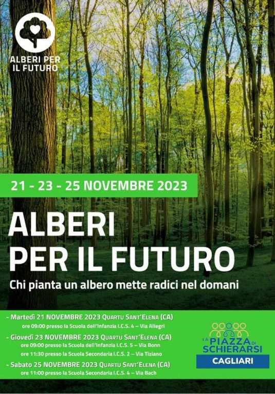 L’associazione Schierarsi di Cagliari, in collaborazione con il Comune di Quartu Sant’Elena, ha aderito all’iniziativa Alberi per il futuro 2023, che si svolgerà nei giorni 21, 23 e 25 novembre 2023 in diverse scuole del territorio.