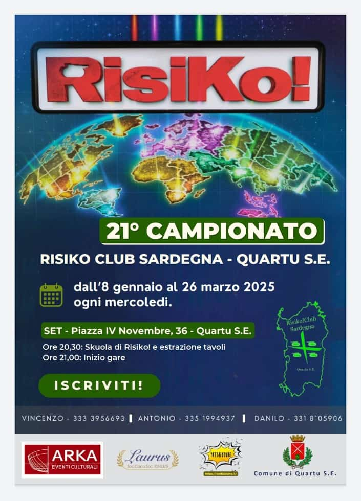 Prossimi appuntamenti a Quartu, in piazza IV Novembre, 36: da mercoledì 8 gennaio al 26 marzo 2025, il 21° Campionato del RisiKo! Club Sardegna; domenica 12 gennaio 2025 il 22° torneo Open (dell’Epifania).