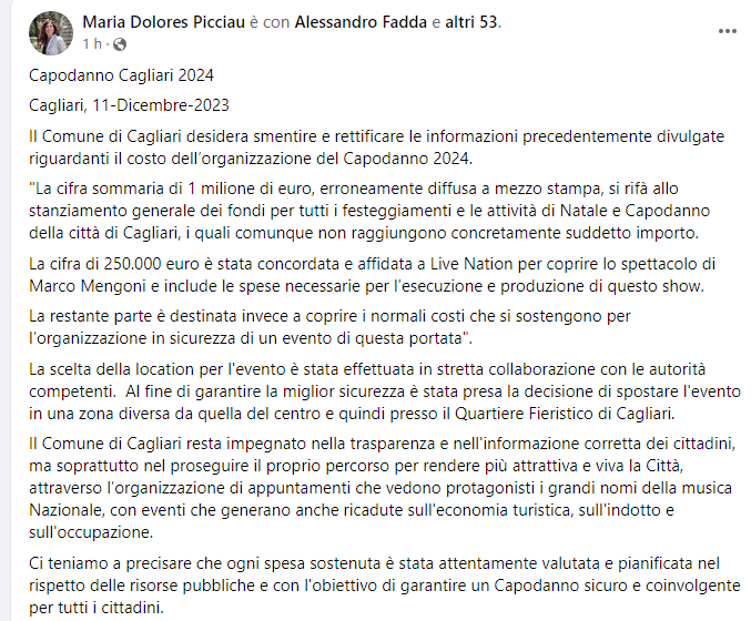 Questo che afferma la Picciau stando alla delibera della Giunta Comunale di Cagliari alla quale ha partecipato smentisce le sue affermazioni, infatti nella delibera n. 269/2023 del 6 dicembre 2023 si scrive testualmente che le somme € 451.950,24 insieme ai € 325.337,16 e ad altri € 250.000,00 sono stanziati per il Capodanno 2024.