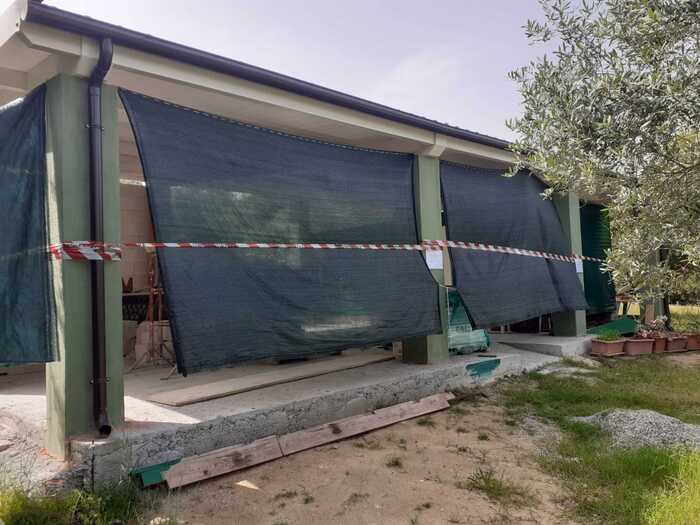 Secondo quanto accertato dai forestali è costituita da un basamento di 5,30 x 7,20 metri e otto pilastri in calcestruzzo, con tettoia in legno e parziale tampinatura in muratura, a ridosso di una casa mobile. L’area è di circa 1.000 mq.