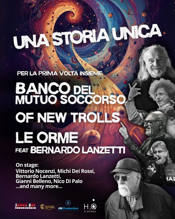 Arriva un annuncio di importanza storica per i fan del progressive rock italiano: il 21 marzo 2026 sul palco del Gran Teatro Geox di Padova e il 30 marzo all’Auditorium Parco della Musica saliranno, per la prima volta assieme, Banco del Mutuo Soccorso, Of New Trolls, Le Orme e Bernardo Lanzetti per un concerto imperdibile e raccontare “Una Storia Unica“.