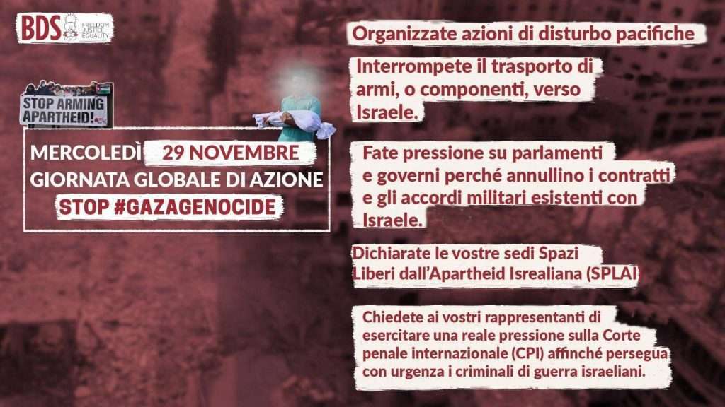 Sotto lo slogan, “Unitevi ora per fermare il genocidio a Gaza e iniziare a smantellare l’apartheid!”, il movimento internazionale BDS guidato dai palestinesi chiama a una Giornata globale di azione il 29 novembre, la Giornata internazionale di solidarietà con il popolo palestinese, per porre fine al “business-as-usual” con l’Israele dell’apartheid. Chiediamo un’intensificazione delle mobilitazioni pacifiche a livello mondiale e delle espressioni di solidarietà per fermare il genocidio, tra cui: