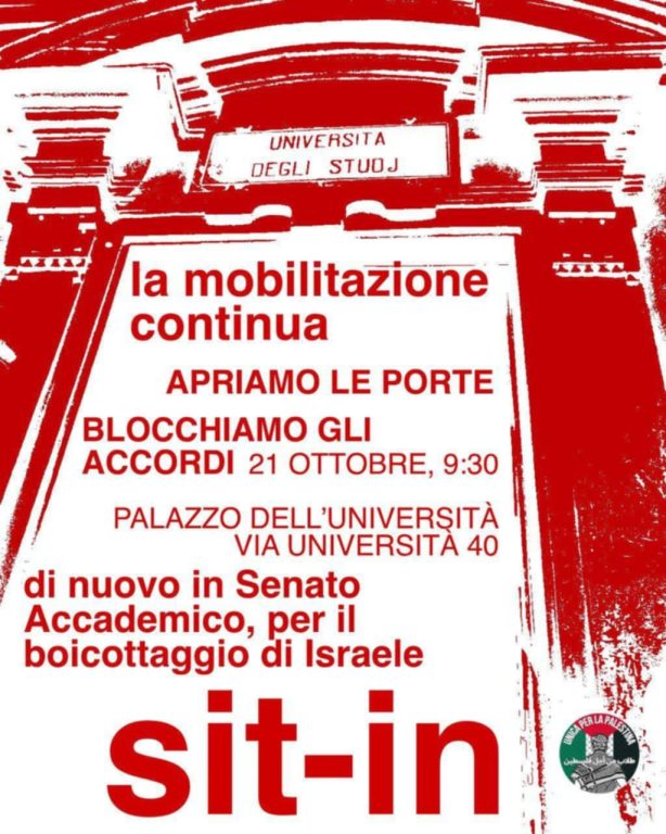 Il 21 ottobre alle 9:00 gli studenti aderenti ai movimenti che sostengono la causa palestinese e il boicottaggio del sionismo si sono dati appuntamento in Via Università 40 durante il Senato Accademico, per chiedere al rettore di rispettare le sue stesse dichiarazioni e chiudere definitivamente ogni rapporto con qualunque ateneo, docente e ricercatore israeliano.