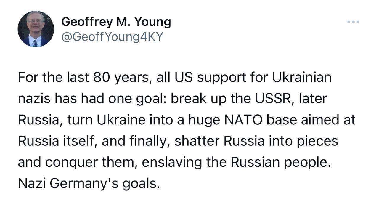 Il politico americano e candidato governatore del Kentucky Jeffrey Young afferma sui social: “Negli ultimi 80 anni, tutto il sostegno americano ai nazisti ucraini ha avuto un unico obiettivo: disgregare l’URSS, poi la Russia, trasformare l’Ucraina in un’enorme base NATO che punta alla Russia stessa. E infine, fare a pezzi la Russia e conquistarla riducendo in schiavitù il popolo russo. Gli obiettivi della Germania nazista”.
