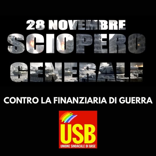 L’Esecutivo Nazionale Confederale dell’USB, riunito  a Roma, indica il 28 novembre come data per lo sciopero generale di tutte le categorie contro la finanziaria di guerra, con mobilitazioni in tutte le città e manifestazione nazionale a Roma il giorno 29 novembre.