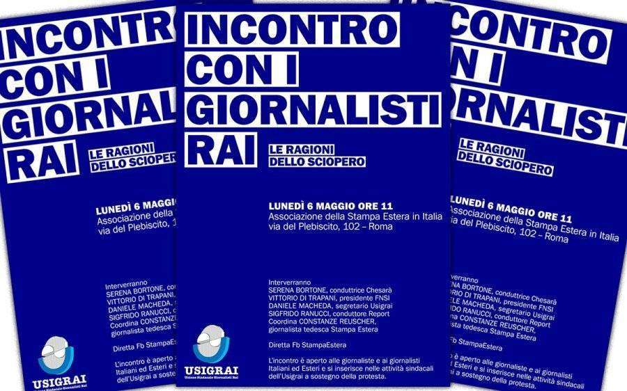 Alle 11 del 6 maggio, presso l’Associazione della Stampa estera in Italia (via del Plebiscito 102, Roma), si terrà un incontro con i giornalisti Rai nel quale verranno spiegati i motivi dello sciopero. All’evento, coordinato dalla giornalista tedesca Constanze Reuscher, interverranno la conduttrice di ‘Chesarà’ Serena Bortone, il presidente della Fnsi Vittorio di Trapani, il segretario Usigrai Daniele Macheda e il conduttore di ‘Report’ Sigfrido Ranucci.