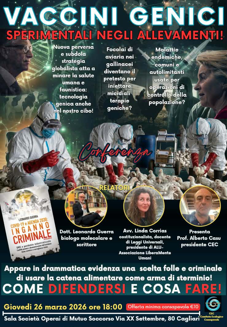“Quindi anche noi sardi, recentemente vittime della truffa della Dermatite Nodulare Bovina, saremo coinvolti. Sapete cosa significa vaxxinare il pollame? Sapete in quali alimenti si utilizzano carne e uova dei gallinacei? Praticamente dappertutto! E cosí i padroni del mondo raggiungerebbero, tramite l’alimentazione, il criminale obiettivo di trattarci tutti con il fantastico “siero magico”! Inoltre, alcune delle “pozioni” proposte sono micidialmente più dannose addirittura dei recenti vaxxini a mRNA autoreplicanti”,,,”La situazione è chiara! Si vuole continuare nel piano folle e satanista di sterminio dell’umanità e della vita sulla Terra! Ma noi lo abbiamo ben compreso e non staremo certamente inerti e passivi! Giovedì quindi se ne parlerà a fondo e vedremo di suggerire anche opportune contromisure”, informano gli organizzatori