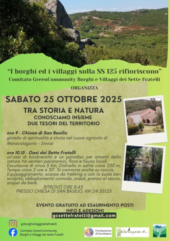 Nell’ambito di iniziative per la tutela ambientale del territorio e la valorizzazione dei borghi e dei villaggi lungo la vecchia SS125 ( attraverso confronti con gli enti preposti per l’ottenimento dei servizi essenziali quali acqua potabile, fognature, strade interne rinnovate, etc.. ), il Comitato Green Community Borghi e Villaggi dei Sette Fratelli ha organizzato delle giornate dedicate alla scoperta del proprio territorio: sabato 25 ottobre 2025 si comincia con la visita alla chiesetta di San. Basilio, piccolo gioiello architettonico presente sul  territorio, per poi proseguire con un’escursione naturalistica all’interno dell’oasi dei Sette Fratelli.